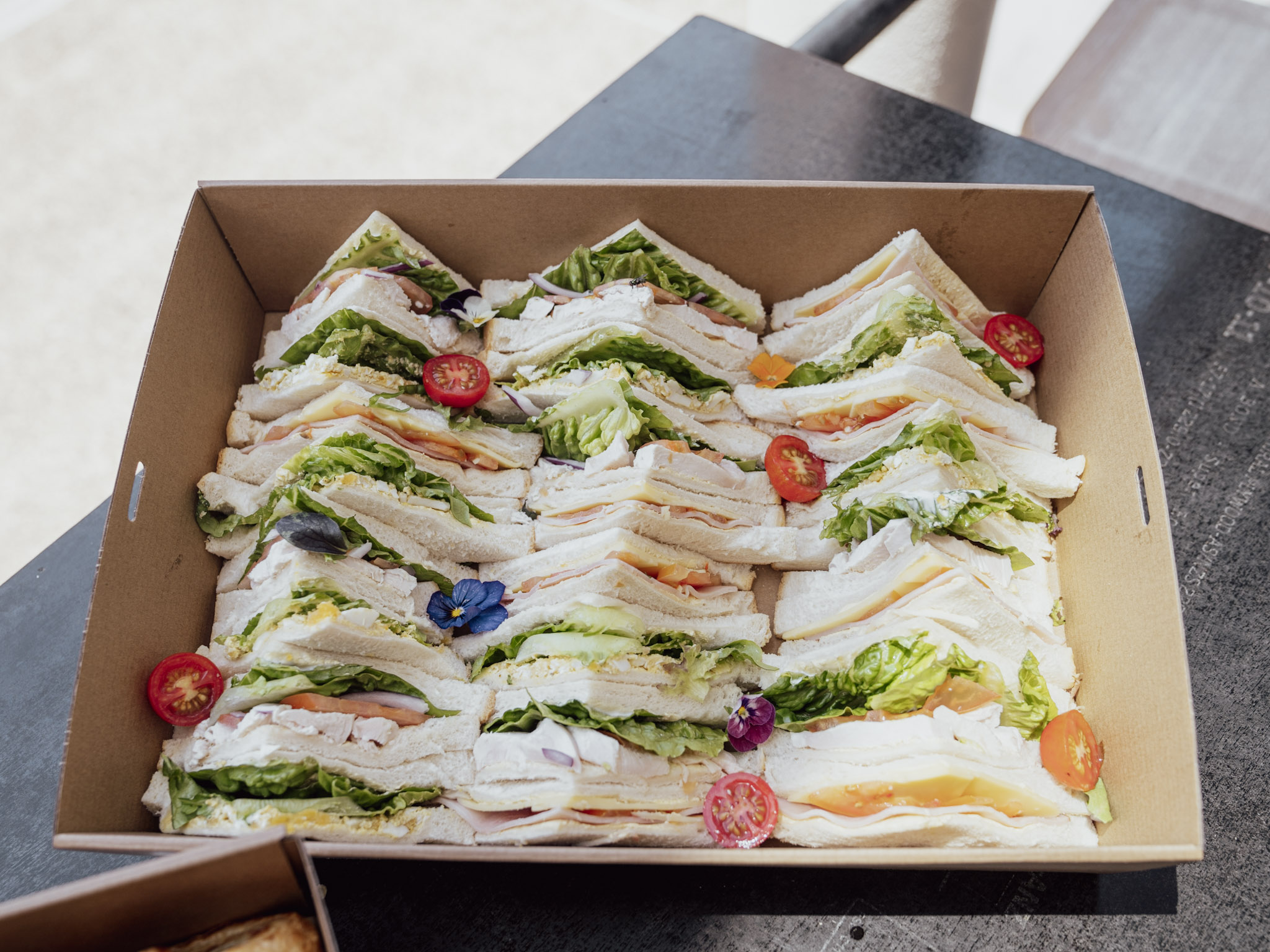 Our menu features gourmet sandwiches and wraps, fresh salads, house-made sweets, breakfast platters, and barista-quality coffee. We also cater to dietary requirements including gluten-free, vegetarian, and vegan options.